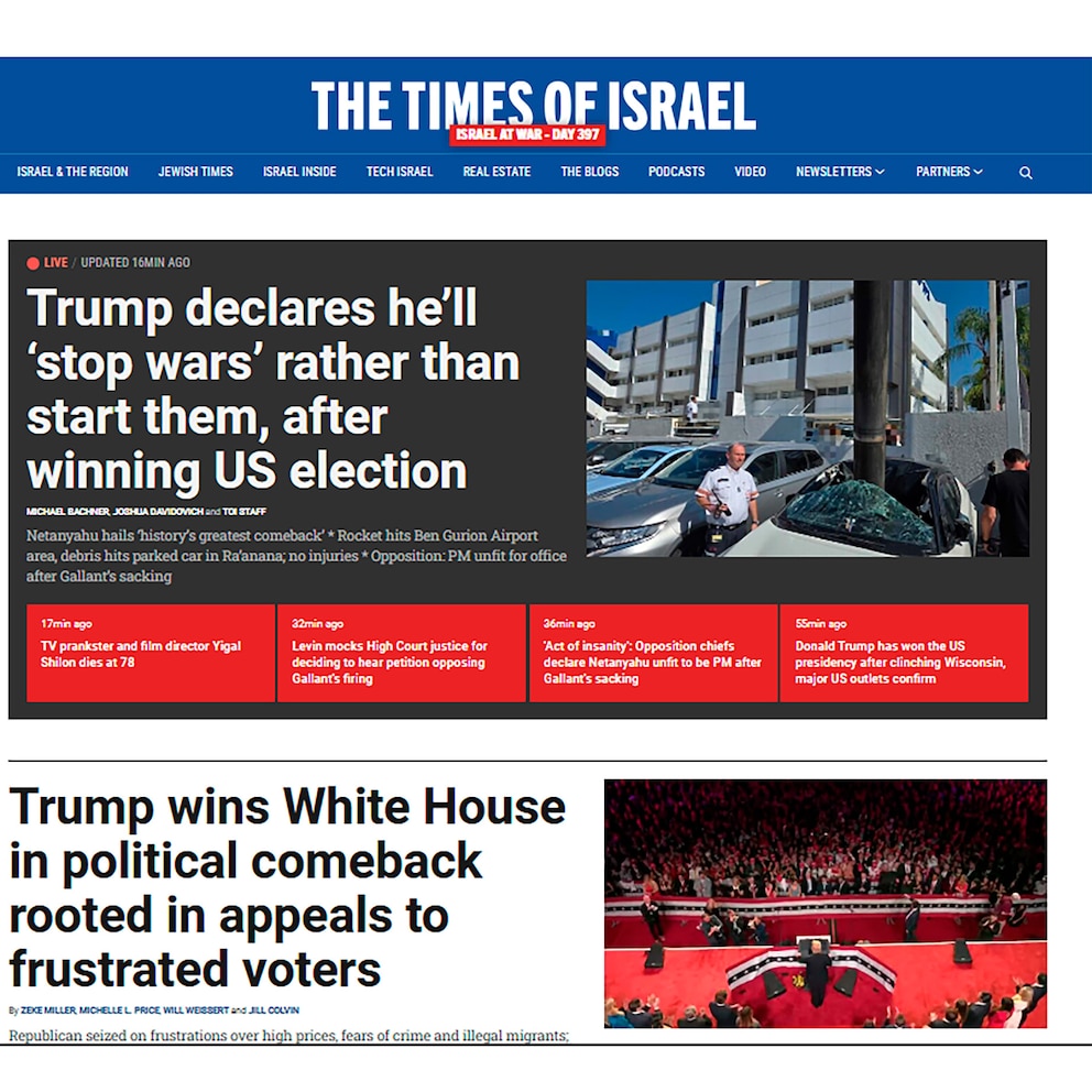 The Times of Israel publicó el titular “Trump declara su victoria en las elecciones estadounidenses y promete que detendrá las guerras en lugar de iniciarlas”.