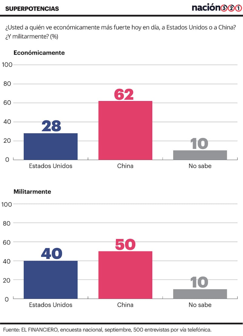Ahora sí, ¿a quién ve usted económicamente más fuerte, a China o a Estados Unidos? De acuerdo con el sondeo, 28 por ciento respondió Estados Unidos, y una mayoría de 62 por ciento dijo que a China. Una diferencia de más de dos a uno.