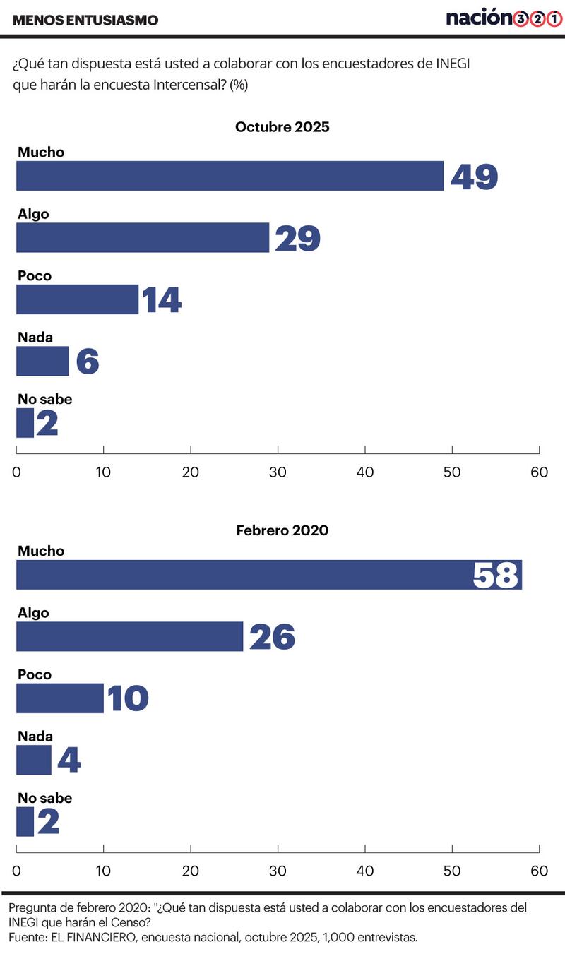 En octubre de 2025, el porcentaje que dijo estar muy dispuesto a colaborar con el INEGI fue casi 10 puntos porcentuales menos: 49 por ciento. Sumado al 29 por ciento que dijo estar algo dispuesto, la disposición a colaborar con el conteo era de 78 por ciento.