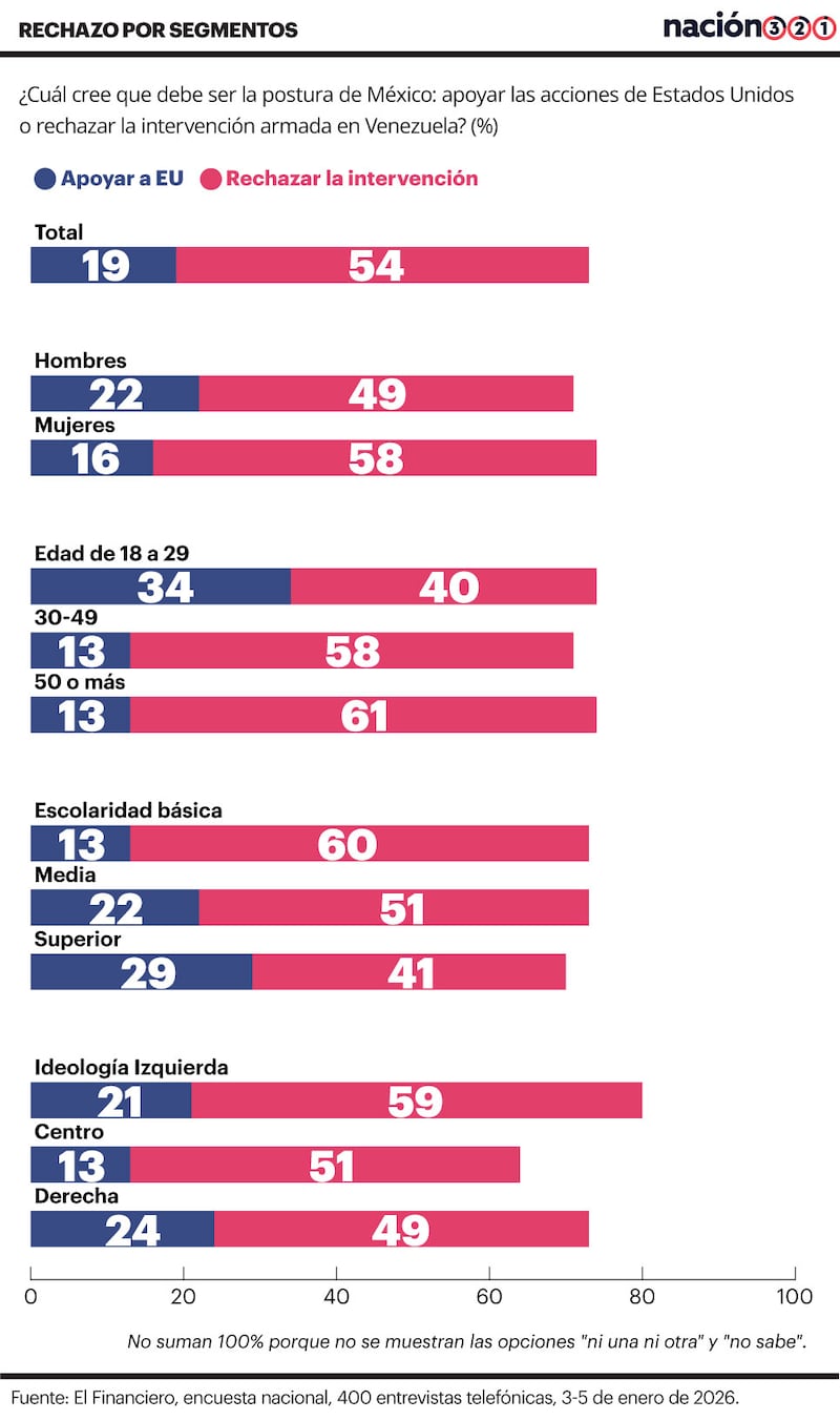 Por lo pronto, la encuesta de EL FINANCIERO sobre las acciones militares en Venezuela, publicada el martes pasado, reveló que la mayoría de la opinión pública mexicana no vio justificación en lo sucedido y expresó un rechazo a la intervención de Estados Unidos en el país sudamericano.