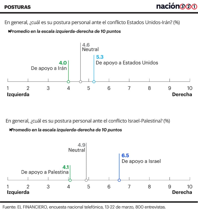 Las personas que apoyan a Irán se ubican, en promedio, en una posición de centro-izquierda, mientras que las que apoyan a Estados Unidos se ubican en una posición promedio de centro-derecha. La mayoría neutral se ubica entre ambas posturas en el espectro ideológico.